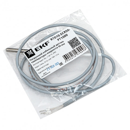 Погружной кабельный датчик температуры жидкости 50 мм EKF RTD10-SCR50-PT1000 - устройства, предназначенные для непрерывного измерения температуры в системах HVAC (ОВиК - отопления, вентиляции и кондиционирования). Датчики представлены в трех сериях: кабельные RTD10, корпусные (с клеммной головкой) RTD20 и комнатные RTD30. Датчики температуры EKF RTD разработаны и изготовлены в России, а также являются полными аналогами датчиков температуры европейских производителей. EKF RTD оснащаются разными типами сенсоров: Pt100, Pt1000 и NTC10k. По способу монтажа делятся на: канальные, врезные (погружные), накладные, наружные и комнатные. Могут работать как жидкими, так и с газообраными средами, неагрессивными к материалам датчиков. Компания EKF принимает заявки на изготовление уникальных модификаций датчиков под Ваши требования.